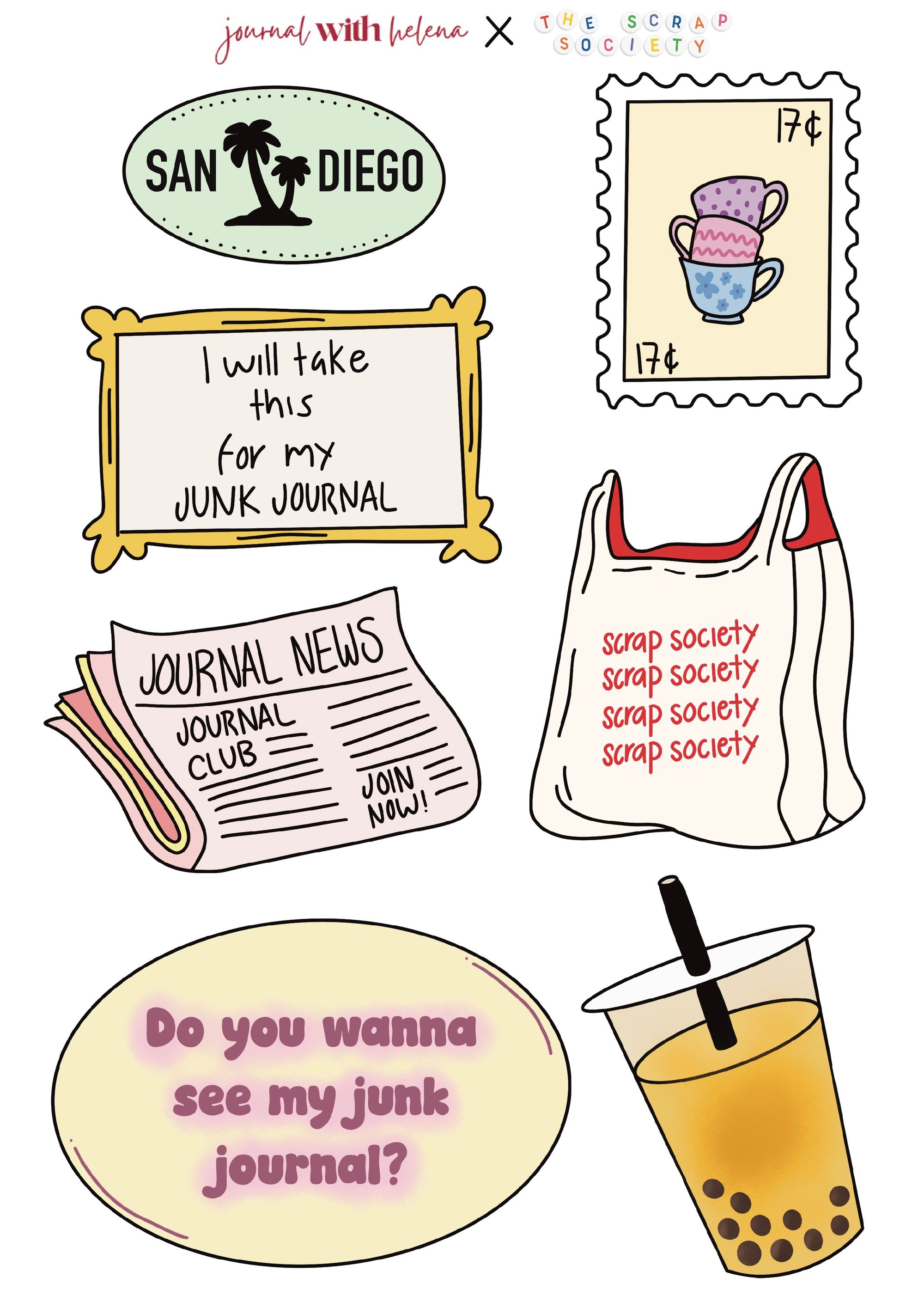 Designed in collaboration with San Diego artist Itzel Helena, this exclusive sticker sheet is part of our SD Scrap Society Artist Collaboration Series. Themed around the Scrap Society and all things junk journaling. Every purchase supports small artists while bringing unique designs to your journals.